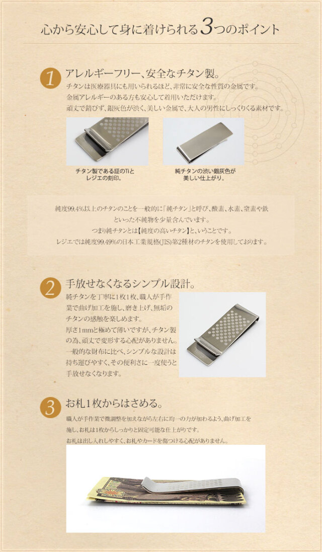 | チタンとは | ・丈夫で軽量(金・プラチナの約1/4の軽さ) ・温泉や海でも変色せず、 錆びない。 ・金属イオンが溶出しにくく、医療器具にも多く用いられ、金属アレルギーの方も安心。 さらに詳しく>> |