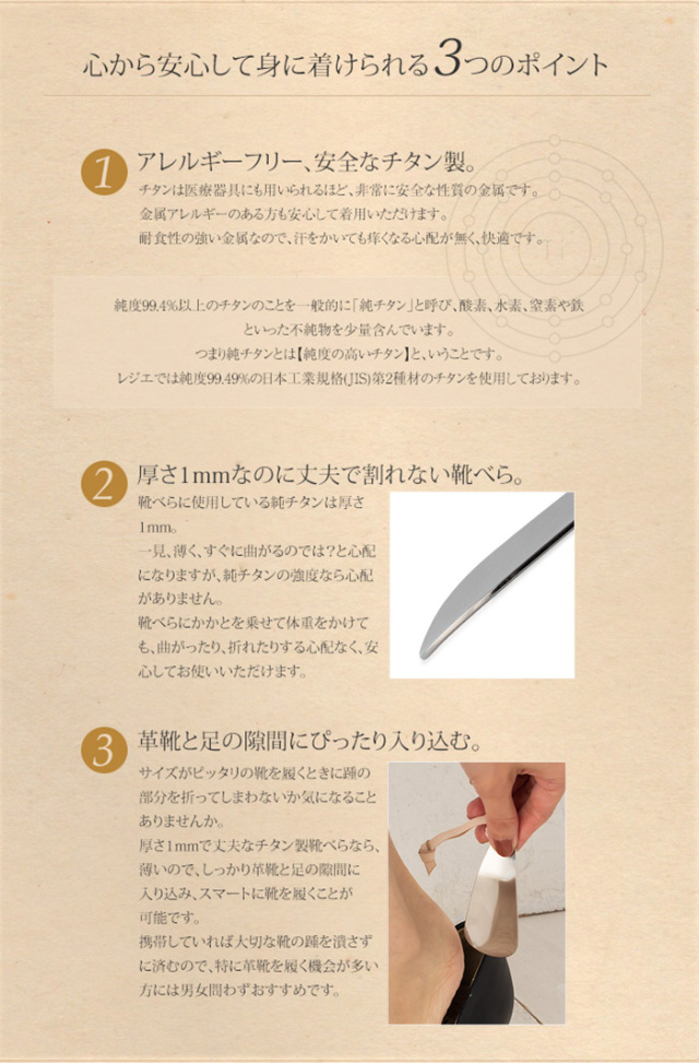 チタンアクセサリー レジエ トップ チタングッズ靴べら 男性への贈り物 女性への贈り物 \ まとめ割り20%OFF 週末限定 / 純チタン 靴べら ( 携帯・キーホルダー / シューホーン ) SH02 価格: ¥5,500 (税込) [ポイント還元 55ポイント〜] 販売期間: 靴ベラ文字: 【2行まで可能】 ご希望の場合は備考欄にご記入下さい。 かな/カナ/漢字:1行10文字 英数字:1行13文字 ※出来上がりまで3-5営業日 ※裏面に文字中央寄せで彫刻 選択してください 希望しない(¥0) 希望する(¥2,200) レビューのお願い: 《金属アレルギー》で困っている方への 商品レビュー を頂けると嬉しいです!(レビュー特典有り) 選択してください レビュー書きます!(感謝です♪) 今回はパス(次回是非!) 数量: 個 在庫 ○ 返品についての詳細はこちら レビューはありません キャンペーン期間:2025年11月14日(金) 20:00 〜 11月18日(火) 10:00 対象はこちら 女性の手や靴になじみやすいサイズの靴ベラです。軽く水などにも強いのでさびにくい純チタン製です。 ギフトラッピングの詳細はこちら※詳細はこちら※商品レビューの書き方はこちら 材 質 純チタン(99.4%以上)、皮(タンニン鞣し) カラー チタン色 サイズ 重量 最大幅 約36.0mm 厚み 約1.0mm 長さ 約77.4mm 重量 約7.3g 関連商品 他の靴べらはこちら ゆうパケット ※日時指定はお受け出来ません。 ※紛失・破損等、商品に対する保証は一切ございません。 チタンとは ・丈夫で軽量(金・プラチナの約1/4の軽さ) ・温泉や海でも変色せず、 錆びない。 ・金属イオンが溶出しにくく、医療器具にも多く用いられ、金属アレルギーの方も安心。 さらに詳しく>> この商品を買った人は、こんな商品にも興味をもっています。 \ まとめ割り20%OFF 週末限定 / ぷっチタン PT8 ¥990(税込) 在庫  ○ 商品を見る \ まとめ割り20%OFF 週末限定 / ぷっチタン貼替シール24枚入 PS ¥440(税込) 在庫  ○ 商品を見る \ まとめ割り20%OFF 週末限定 / 純チタンホイッスル(笛) TH02 ¥13,200(税込) 在庫  ○ 商品を見る \ まとめ割り20%OFF 週末限定 / 純チタンフェイスローラー FR02 ¥4,400(税込) 在庫  ○ 商品を見る \ まとめ割り20%OFF 週末限定 / 純チタンアクセサリー専用 お手入れクロス(ジュエリークロス) cloth ¥550(税込) 在庫  ○ 数量:0123456789101112131415161718192021222324252627282930 枚 \ まとめ割り20%OFF 週末限定 / 純チタン アジャスター ナチュラル AJ01 ¥3,300(税込) 在庫  ○ 商品を見る
