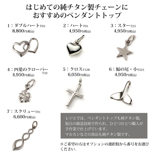 | 注意事項 | ※チタンアクセサリーをはじめて使う方にアレルギーの心配がないかお試しいただくためにご用意したネックレスです。 2回目以降のご利用の方は通常価格でご用意しているネックレスをご利用下さい。 |