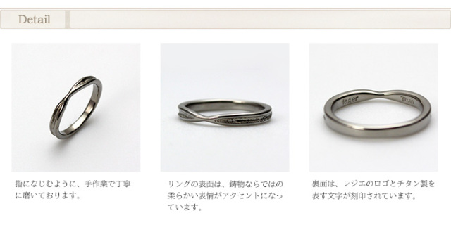 | チタンとは | ・丈夫で軽量(金・プラチナの約1/4の軽さ) ・温泉や海でも変色せず、 錆びない。 ・金属イオンが溶出しにくく、医療器具にも多く用いられ、金属アレルギーの方も安心。 さらに詳しく>> |