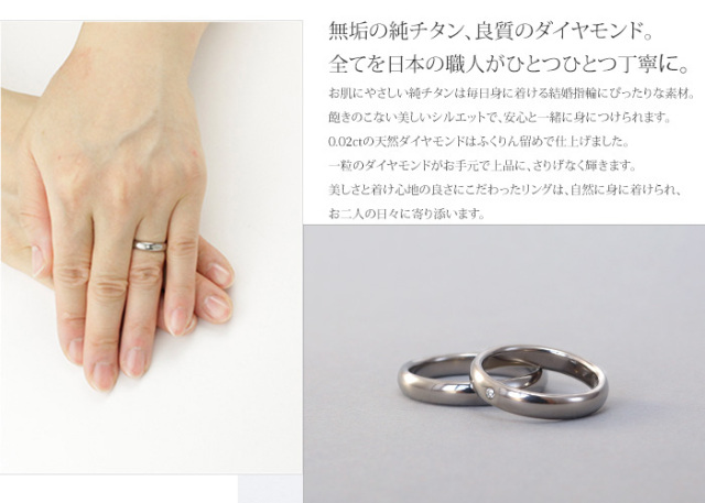 | チタンとは | ・丈夫で軽量(金・プラチナの約1/4の軽さ) ・温泉や海でも変色せず、 錆びない。 ・金属イオンが溶出しにくく、医療器具にも多く用いられ、金属アレルギーの方も安心。 さらに詳しく>> |