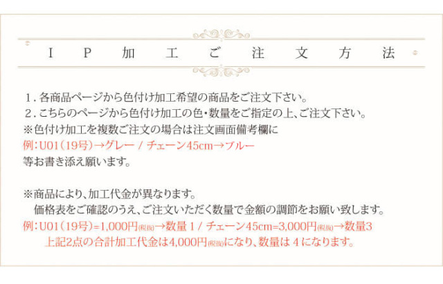 | ご注文方法 | 1.各商品ページから色付け加工希望の商品をご注文下さい。 2.こちらのページから色付け加工の色・数量をご指定の上、ご注文下さい。 ※色付け加工を複数ご注文の場合は注文画面備考欄に 例:U01(19号)→グレー U01(9号)→ブルー 等お書き添え願います。 |